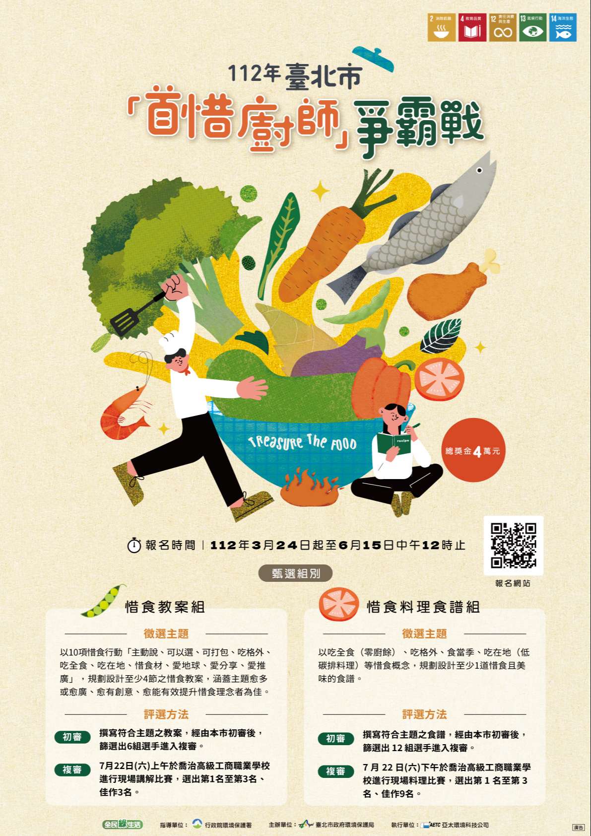 一、為呼應聯合國於2030年前零售及消費者減少50%食物浪費的 永續發展目標,儘可能發揮食材價值的最大化,本局將辦 理112年臺北市「首惜廚師」爭霸戰,於3月24日(五)至6 月15日(四)中午12時止開放報名,競賽分為「惜食料理 食譜組」及「惜食教案組」,各組前3名除可獲得獎金外, 各組第1名將代表北市參加環保署辦理之全國賽。本次「首 惜廚師」甄選活動分為初審及複審2階段進行,初審訂於7 月上旬進行書面評審,並於7月7日(五)於臺北市環境保 護局官網及「臺北市無圍牆環境教育博物館網站」公布入選者,複審將於7月22日(六)於北市喬治高級工商職業學 校進行,透過實作方式選出優勝者,本競賽複審簡述如 下: