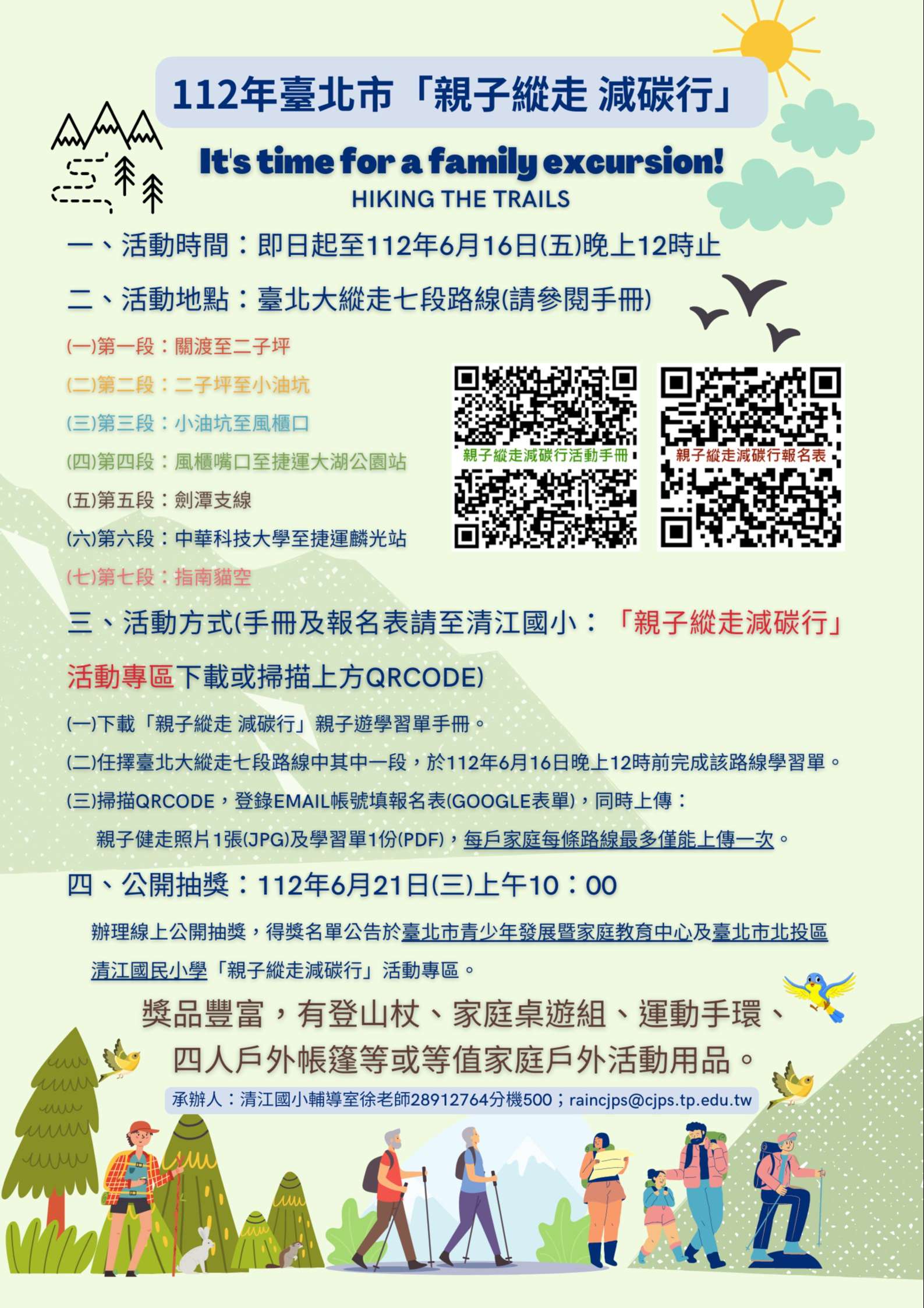 五、本活動訂於112年6月21日(星期三)上午10時辦理線上公 開抽獎,得獎名單公告於臺北市青少年發展暨家庭教育中 心網站及臺北市北投區清江國民小學「親子縱走減碳行」 活動專區。倘有疑義,請洽臺北市北投區清江國民小學輔 導室徐老師,電話:02-28912764轉500;Email: raincjps@cjps.tp.edu.tw。