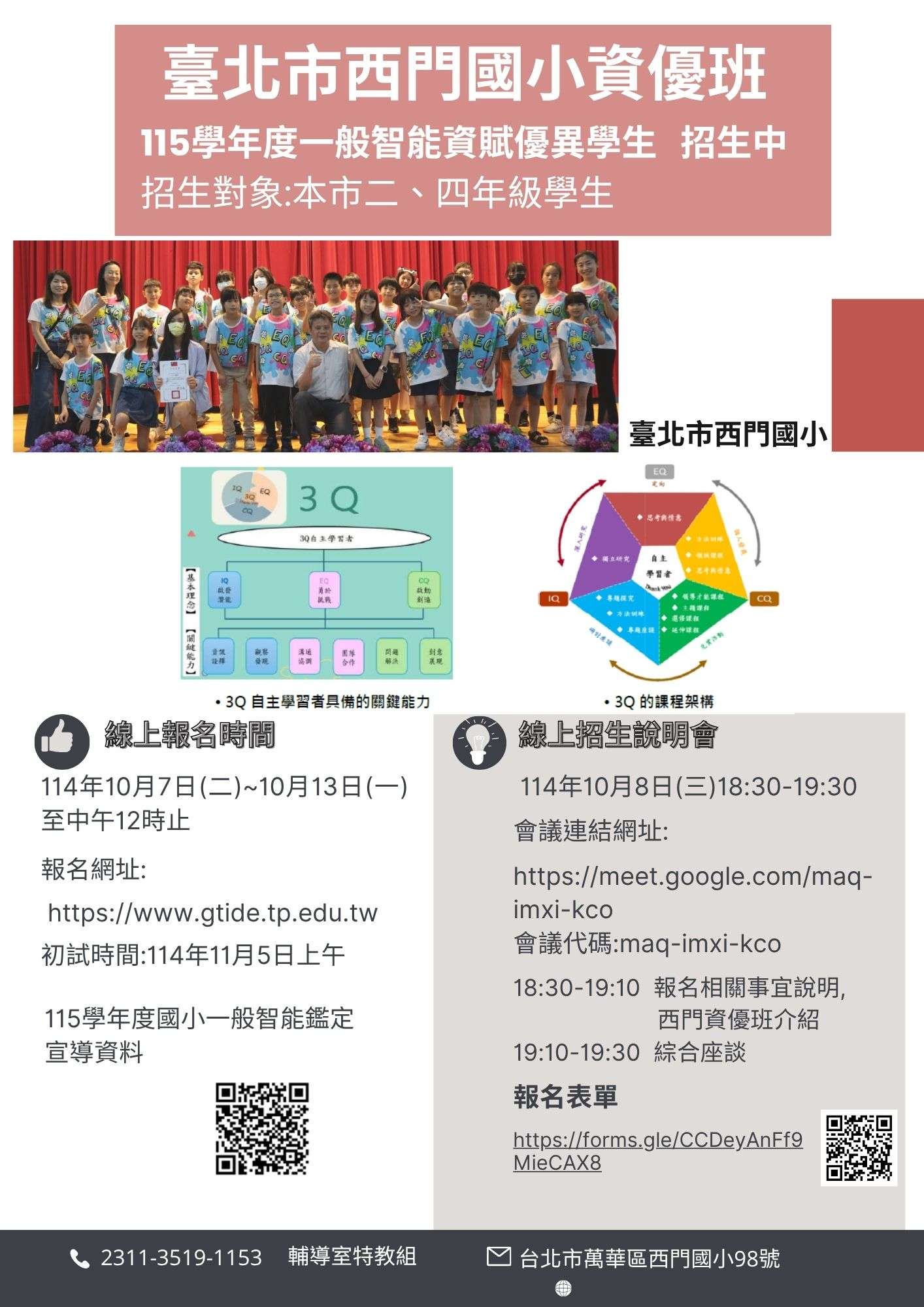 一、該校訂於114年10月8日晚上6點20分至7點30分辦理115學 年度一般智能資賦優異鑑定安置說明會。