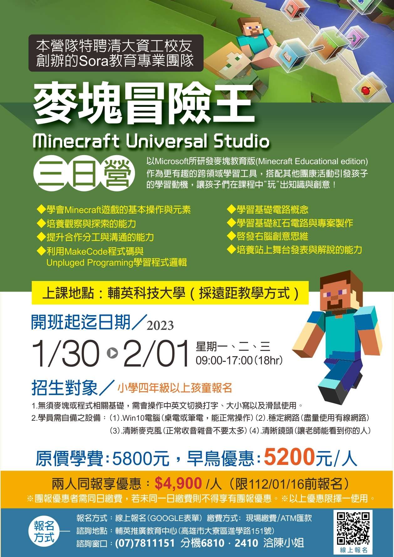 一、課程特色:以Microsoft所研發麥塊教育版(Minecraft Educational edition)作為更有趣的跨領域學習工具,搭 配其他團康活動引發孩子的學習動機,讓孩子們在課程中" 玩"出知識與創意