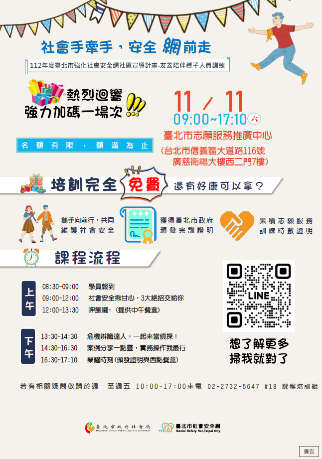 轉知臺北市政府社會局112年11月11日(星期六)辦理「臺北市強化社會安全網 社區宣導計畫—友善陪伴種子人員訓練」