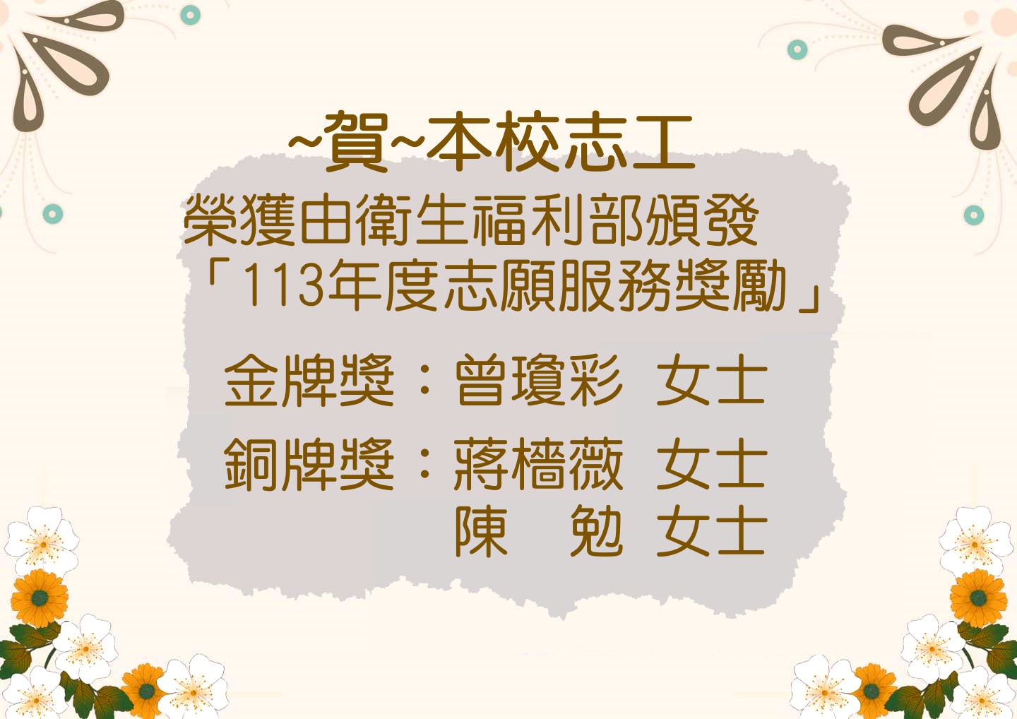 本校榮獲衛生福利部「113年度志願服務獎勵」獎項志工名單如下: