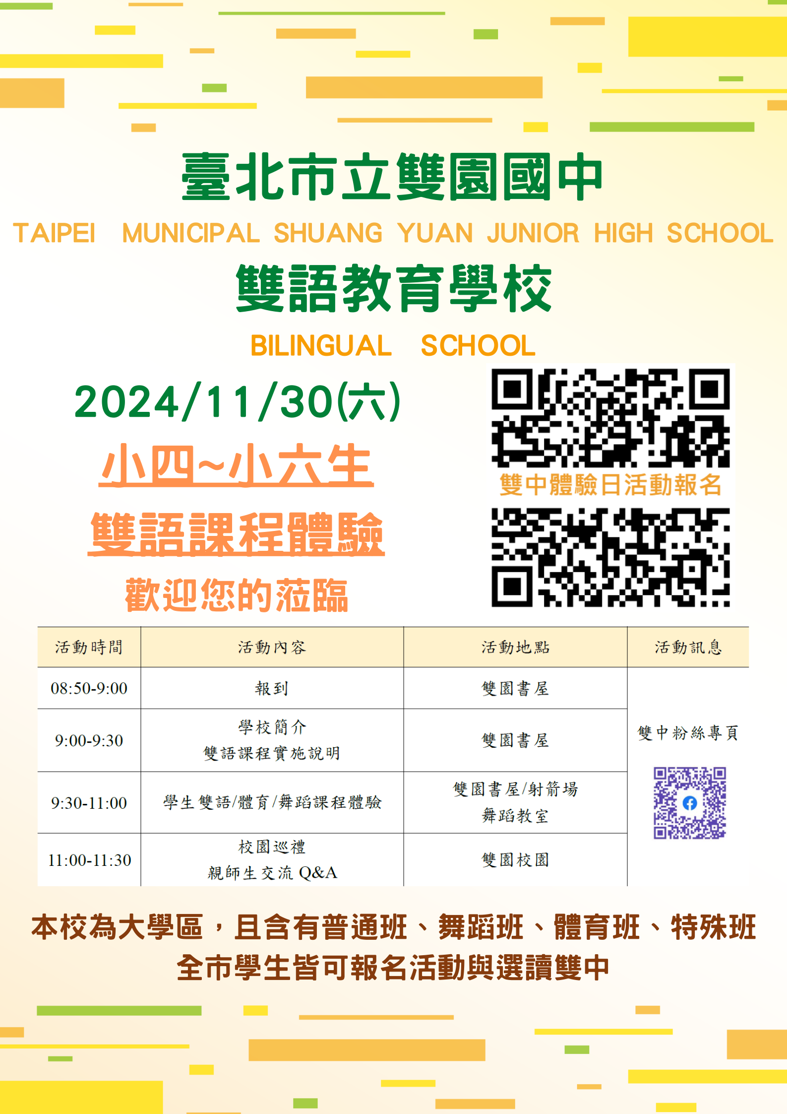 轉知臺北市立雙園國民中學辦理「113學年度學校參觀體驗日活動」